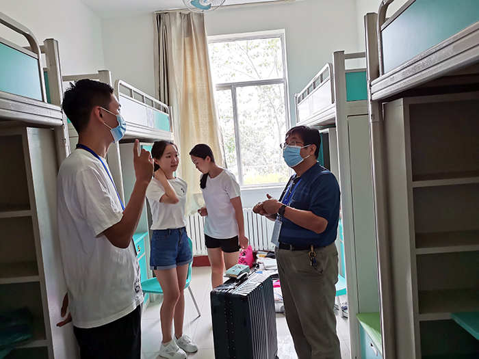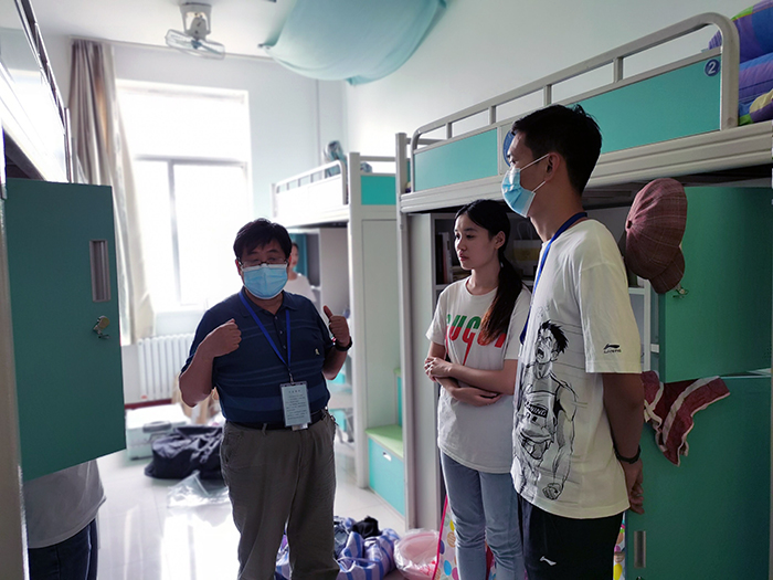 9月23日,437ccm·必赢国际党委副书记兼副院长裴国栋冒着细雨来到新生宿舍看望2020级转段新生。