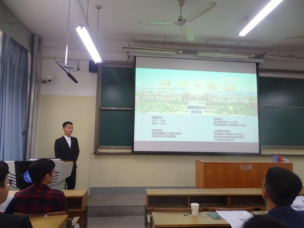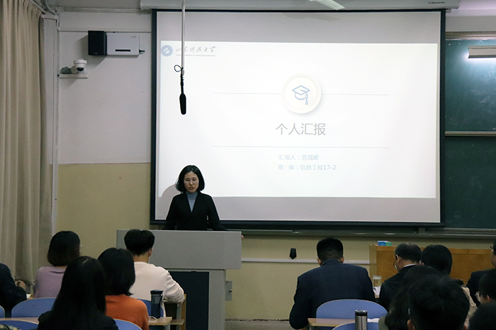 答辩在东校园5103和西校园2104分别依次进行,参会的13名老师及6名学生代表担任答辩评委。23名答辩人按照会前抽签顺序依次上台,采用PPT和现场演说相结合的形式,就思想状况、学习情况、工作情况、科技创新、志愿服务、社会实践、所获奖励等方面的表现进行了汇报展示,答辩评委结合候选人的展示内容进行了现场提问。整个答辩现场庄重而热烈,候选人精神饱满、自信大方,现场观摩学生认真倾听,不时为答辩人的精彩表现报以热烈掌声。