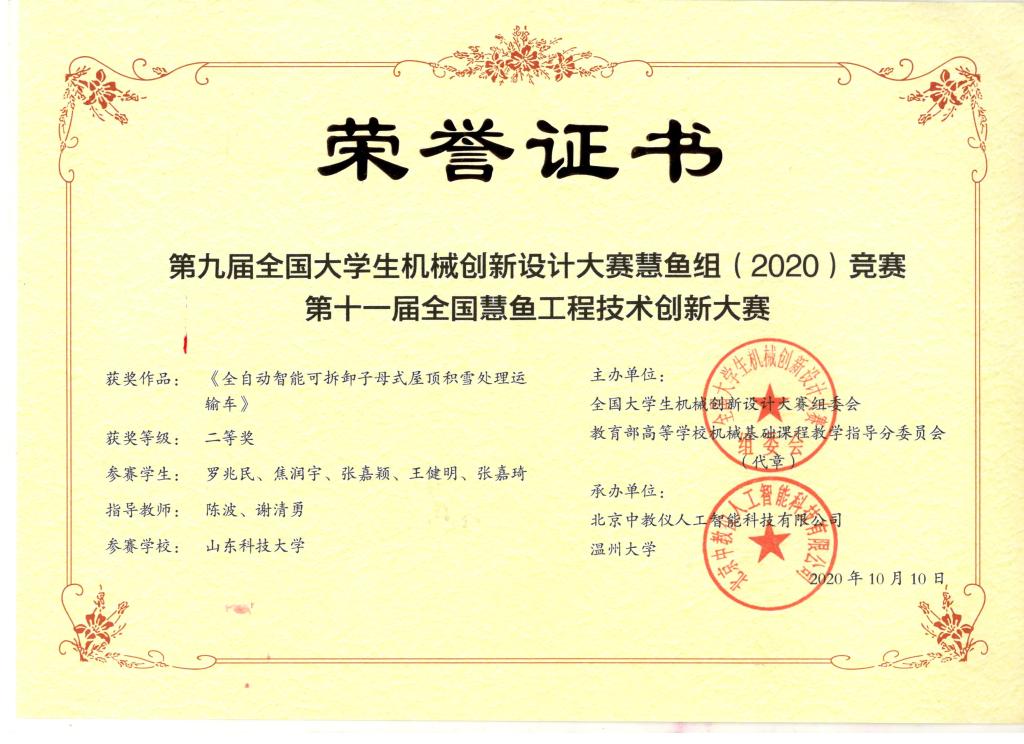 近日,第九届全国大学生机械创新设计大赛慧鱼组竞赛落下帷幕。437ccm·必赢国际积极组队参加比赛,并取得优异成绩。其中“全自动智能可拆卸子母式屋顶积雪处理运输车”(参赛学生:罗兆民、焦润宇、张嘉颖、王健明、张嘉琦 ,指导老师:陈波、谢清勇)获得国家二等奖,“‘分类精灵’字母式物联网智能垃圾箱”(参赛学生:王帅、焦润宇、罗兆民、王健明、步宇,指导老师:陈波、李保银)、“智能伸缩式阶梯型助老爬楼椅”(参赛学生:王健明、罗兆民、王安航、袁忠阳、王庆杰, 指导老师:陈波、刘秀杰)两个项目获得国家三等奖。