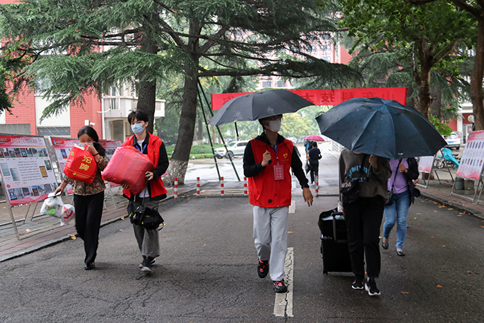 热情服务,关爱新生到校如家。秋雨淅沥,但丝毫不减新生报到的热情,迎新志愿者们和党员先锋队队员全程引导新生报到,积极为新生搬运行李,向他们介绍报到流程和专业设置等相关事宜。学院领导也莅临迎新现场指导工作,了解迎新工作情况,积极回答学生及家长的问题,对各部门工作人员和志愿者的辛勤付出表示感谢。