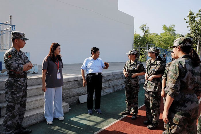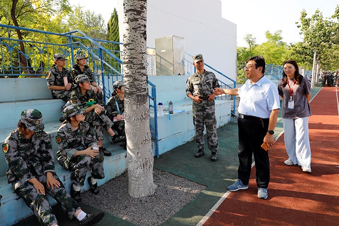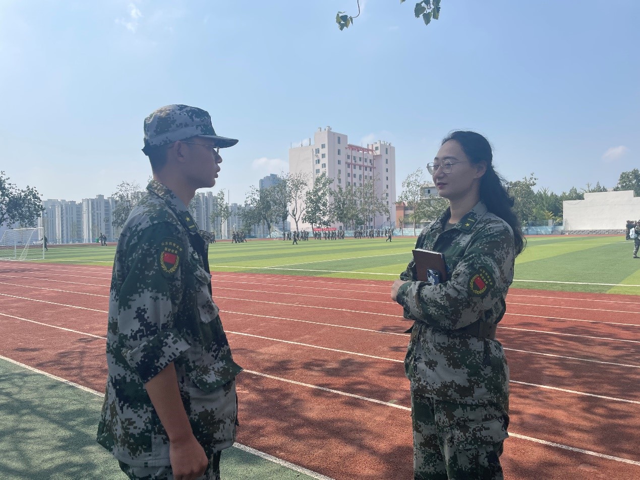 9月10日,437ccm·必赢国际党委副书记兼副院长裴国栋、辅导员曹园、孙丽、李明蔚深入军训现场与新生亲切交谈。