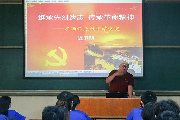 追忆往昔续征程,不忘初心担使命。战卫明以“继承先烈遗志 传承革命精神”为题为同学们上了一堂生动的党课。他详细讲述了自己参加革命战争的经历,通过一个个激烈的战斗场面,一个个为履行国际主义义务而浴血奋战,将生死置之度外,用生命和鲜血保卫祖国的英雄事迹,带领同学们缅怀革命先烈,找寻入党初心,坚定理想信念。最后,他带领学生党员们面向党旗重温入党誓词,勉励同学们继承先烈遗志,传承革命精神,牢记入党初心,不忘使命,勇于担当,怀揣“强国有我”的宏大志向,为中华民族的伟大复兴做出无愧于时代的贡献!