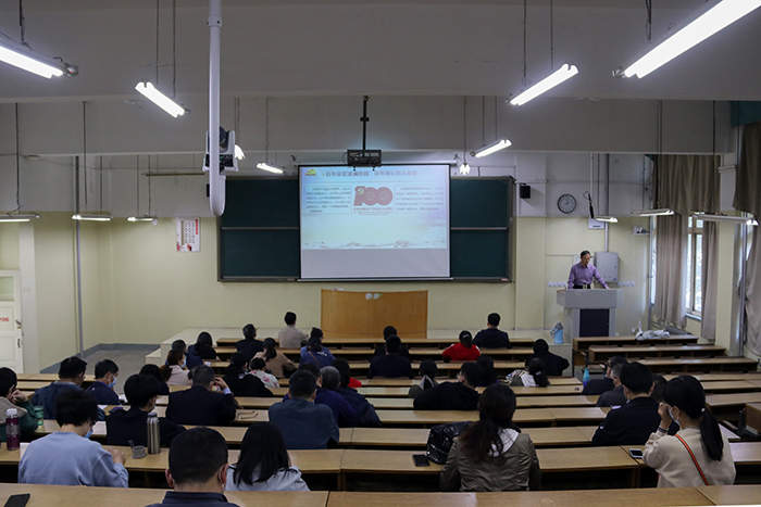 陈福刚以“百年征程波澜壮阔,百年初心历久弥新”为主题,沿着学史明理、学史增信、学史崇德、学史力行的逻辑脉络,从我党百年历史的四个阶段所蕴含的历史内涵及时代特征、百年历史的建党精神所孕育的精神之源与动力引擎、百年历史的弘扬赓续与深悟百年之问和百年之思三个主题进行了宣讲。陈福刚引经据典,讲述了毛泽东、周恩来等老一辈革命家和革命先烈为建立、捍卫、建设新中国而舍生忘死、呕心沥血的奋斗伟绩,用一个个鲜活的历史人物,一个个生动的历史故事,把学党史和悟思想贯通起来,让党员们更加深刻地感悟共产党人的初心和使命,更加深刻地感受中国共产党的伟大和英明。陈福刚在宣讲中强调,要认真学习习近平总书记“七一”系列重要讲话精神,切实把思想和行动统一起来,牢牢把握学党史、悟思想、办实事、开新局的要求,切实做到学史明理、学史增信、学史崇德、学史力行,真正以党史照亮前行之路,做到信仰如山;以党史洗涤心灵之尘,做到信念如铁;以党史激发奋进之力,做到信心如磐。同时,要积极发挥教工党员的模范带头作用,履职担当,敬业奉献,肩负起新时代教书育人、科学研究与服务社会的工作重任。