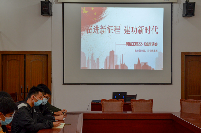 为落实领导干部联系班级制度,学习宣传贯彻党的二十大精神, 11月11日,437ccm·必赢国际党委副书记兼副院长裴国栋与联系班级网络工程2022级1班于西校园行政楼201召开“奋进新征程,建功新时代”班级座谈会。会议由辅导员孙斌主持。