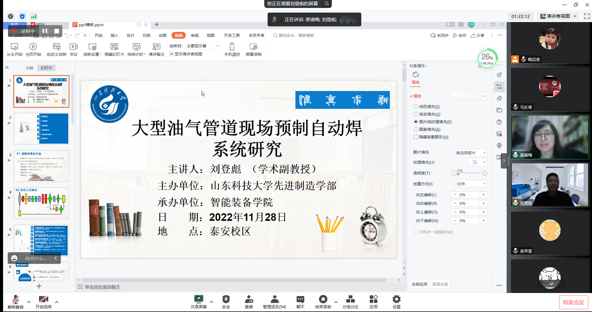 会议伊始,马长青老师首先向与会人员汇报了“矿压大数据监测与分析一张图系统建设与应用”项目相关概况,从项目背景、建设内容、主要创新点和现场应用四部分展开了详细的介绍。随后,马长青对老师与同学们提出的问题进行了耐心细致的解答,为先进制造部青年学者提供了宝贵的经验,畅谈了矿压数据检测方面未来深入研究的方向。刘登彪老师以“大型油气管道现场预制自动焊系统研究”为主题,从课题背景、工艺要求、系统建构、分系统研究和整体结构设计五个方面展开论述,并分享了大量的现场实施影视资料,让青年学者们对输油管道自动焊系统的工艺要求到现场实施有了更深入的了解和更系统的认知。