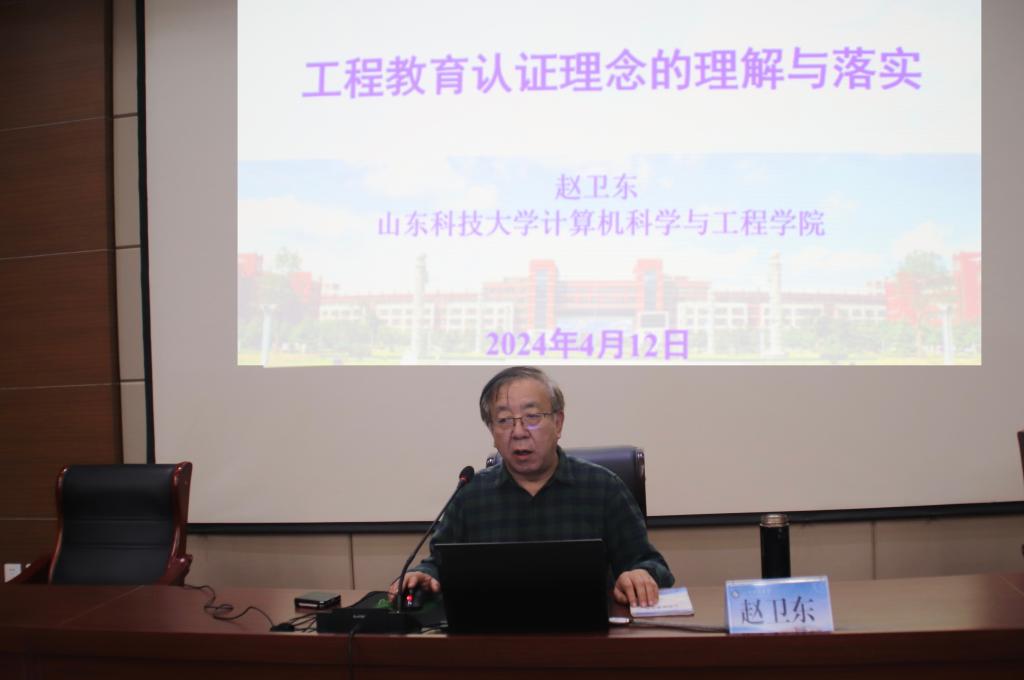 赵卫东作了题为“工程教育认证理念的理解与落实”的报告。他从工程教育本科专业认证概述、工程教育专业认证理念、培养目标、毕业要求与观测点、课程体系、课程与课程目标六个方面,深度剖析网络工程专业核心精髓,对工程教育专业认证的目标及注意事项做了深入阐述。他强调,要做好专业认证必须重点把握以下几点:一是要坚守立德树人基本任务,做到与时俱进,实事求是,开放思想,真正地以学生为中心。二是人才培养要符合德智体美劳全面发展的社会主义建设者和接班人的总要求,符合学校人才培养定位;注重具体能力培养,提高学生专业素质,并应用到具体实践中,尤其在学生的毕业要求中,应重点关注其是否具备对自然科学以及复杂工程问题的解决能力。三是要注意工作协调,准备充分,营造出安全有序高效的良好氛围。四是要坚定信心,精益求精,抓主线守底线,高标准严要求,做好各环节的具体工作,通过认证彰显学院的教学风采和专业特色。