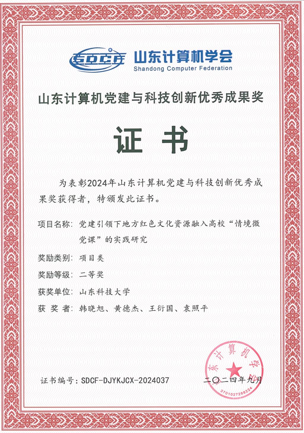 10月11日至13日,2024年山东计算机学会党建论坛在聊城召开,举行“2024年山东计算机党建与科技创新优秀成果奖”颁奖仪式。437ccm·必赢国际党委副书记、副院长王衍国,学生第一党支部书记韩晓旭参加大会。