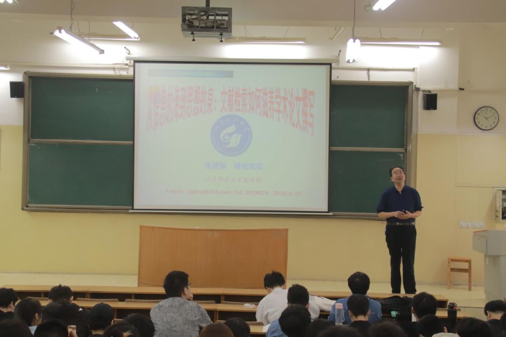 张建国围绕“文献信息资源检索滋养与赋能学术论文撰写”这一主题,围绕“超越IQ与EQ:通往未来的第三种‘超能力’”“为思想开疆拓土:文献检索如何塑造你的研究视野”“从思绪到典藏:构建一篇合格学术论文的航图”“从星海到航线:高效文献检索的方法与策略”“从星图到足迹:文献检索在论文中的实战演练”等五个内容进行讲解。张建国结合自己多年来的研究心得和大量具体鲜活的检索案例,从“成功=智商+情商+搜商”到文献信息资源检索对科学研究和科技发展的重要作用;从学术论文的内涵、类型、特点及其撰写规范到文献信息资源检索目前普遍存在的困境、文献资源的类型及其特点以及怎么样精准检索文献信息资源;从检索词的遴选和提取、检索表达式的构建调整与优化到如何在海量文献信息中发现高质量文献及其发展脉络,进而从文献的引用关系寻踪觅迹……他条分缕析,娓娓道来,环环相扣,层层递进,深入浅出的为同学们进行系统分析与详细阐述。