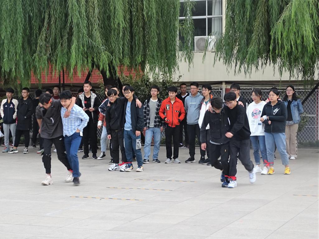 步入东校园文化广场,“一!二! 加油!”热情的呐喊声、欢呼声赶走秋风,青春的热浪袭面而来。广场上的同学们个个雄姿英发,男生争先恐后,女生不让须眉,齐心竞逐第一。趣味运动会包含拔河比赛、两人三足和旋转足球三个项目,在齐心协力喊号声中,同学们都用出了十足的力气,在拔河比赛里争夺冠军宝座。在两人三足比赛中同学将伙伴的默契感发挥到极致,即使有捆绑限制行动,也能奔走如常。考验同学们平衡感的旋转足球比赛中,原地低头旋转十圈,同学尽力克服眩晕感,摇摇晃晃将足球射入球门内,乐趣十足。