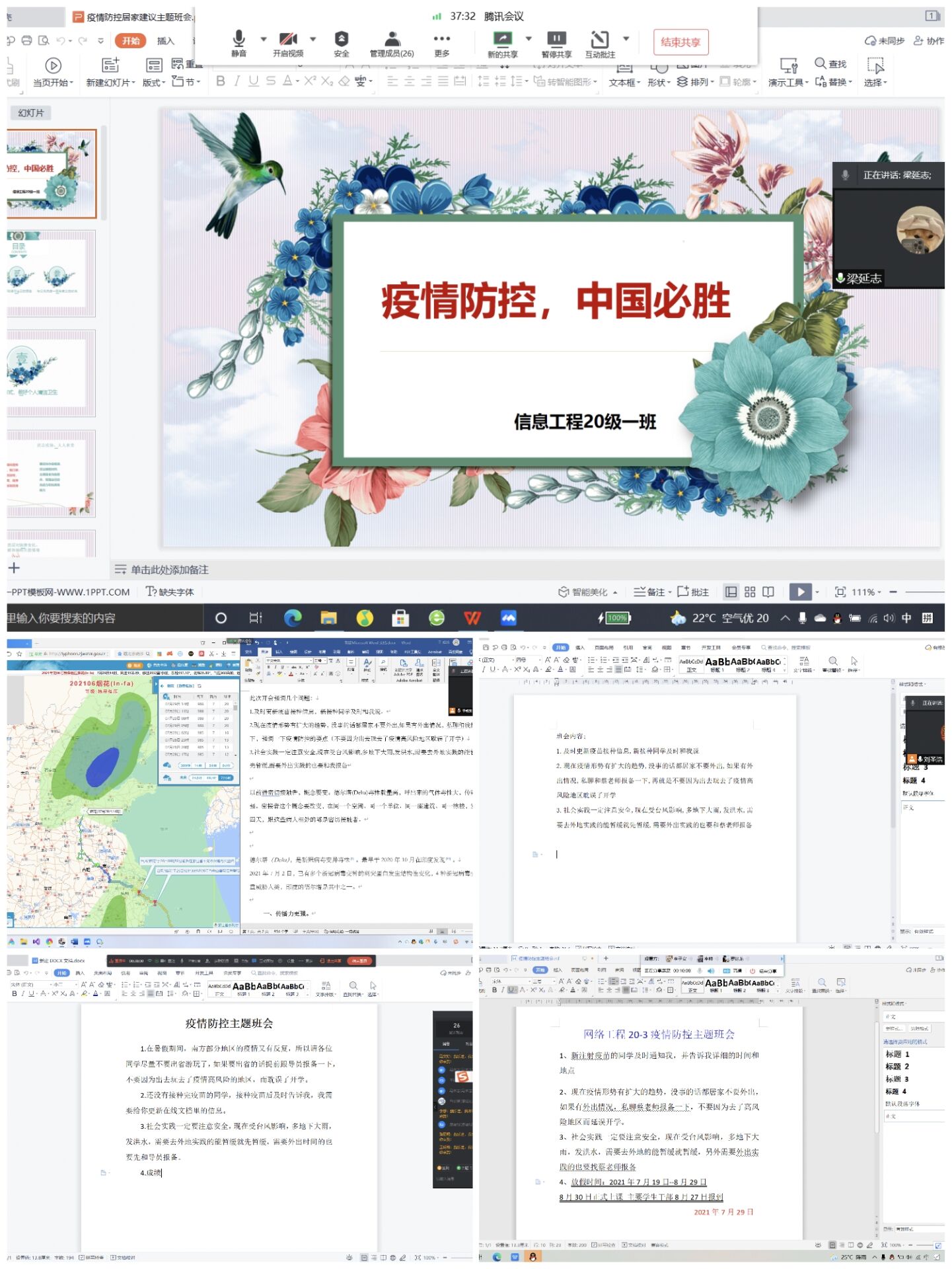 为进一步落实学校防控期间的防控工作要求,增强学生的新冠肺炎疫情防控知识,提高学生的防疫防控意识,8月5日至8月6日,437ccm·必赢国际召开线上疫情防控主题班会,会议由辅导员主持,全体学生参会。