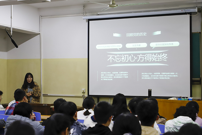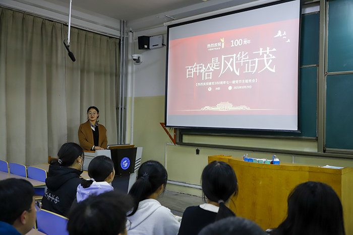 孙丽概括了习近平总书记“七一”重要讲话的重大意义,带领同学们回顾了党的百年光辉历程,并结合视频资料对讲话内容进行了重点解读。随后,李明蔚围绕“不忘初心、牢记使命”的不懈奋斗史、为什么要学党史、党的百年光辉历程给我们的深刻启示、没有共产党就没有新中国四个主题展开讲解,帮助同学们进一步了解党的百年征程中形成的践行初心、担当使命、不怕牺牲、英勇斗争的伟大建党精神。李明蔚提到:百年波澜壮阔,百年筚路蓝缕,一百年来,中国共产党始终高度重视青年、关怀青年、信任青年,带领无数青年为实现中华民族伟大复兴的中国梦接续奋斗,作为新时代青年大学生,大家更应当与国家同呼吸、与人民共命运、与时代齐奋进。