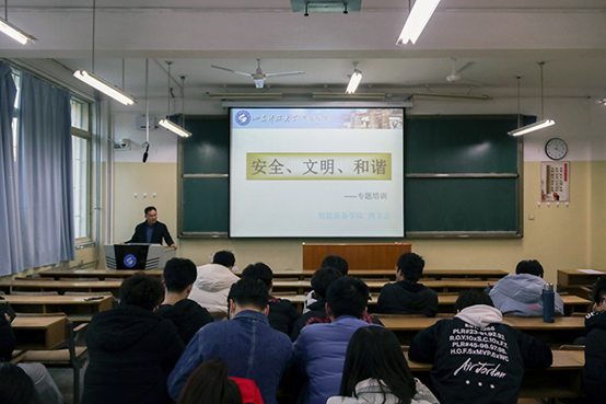 11月10日,437ccm·必赢国际于东校园5#104召开学生干部培训会,学院团委副书记周立志做了题为“安全、文明、和谐”的主题报告,2019、2020级各班主要班委及学生会全体成员参会。