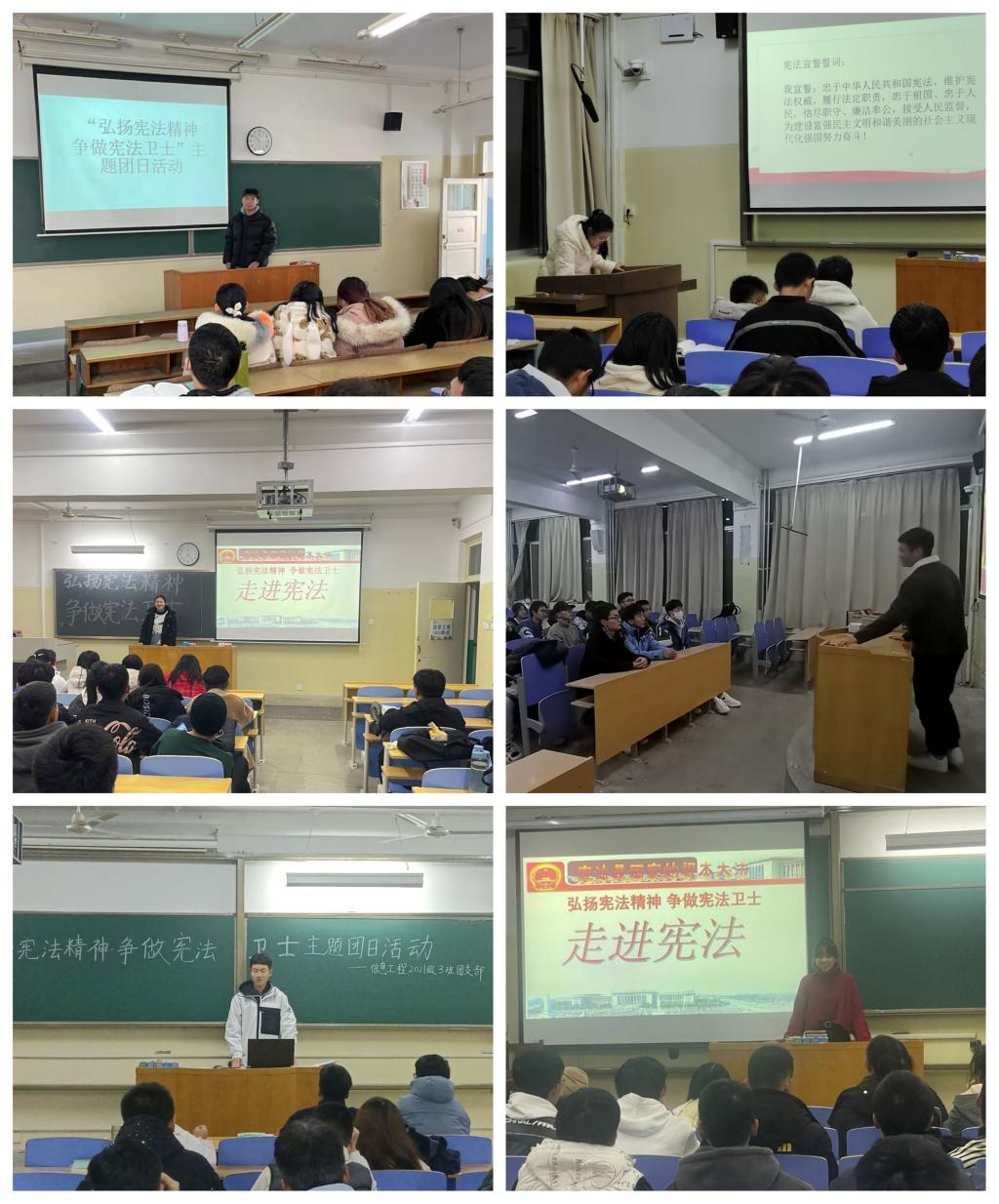 会上,团支部书记向同学们传达了习近平总书记宪法重要论述精神,论述当代大学生尊法、学法、守法、用法的原因,带领同学们深入学习了《中华人民共和国宪法》部分篇章,并围绕宪法设立背景向同学们详细阐述了宪法的历史、地位和作用等方面,号召同学们不仅要学习宪法,更要领略其精神,学会运用法治思维去处理问题,解决争端,保障自己和他人的权益。同学们各抒己见,纷纷表示要主动学习宪法、自觉捍卫宪法,为实现中华民族伟大复兴的中国梦而不懈奋斗。
