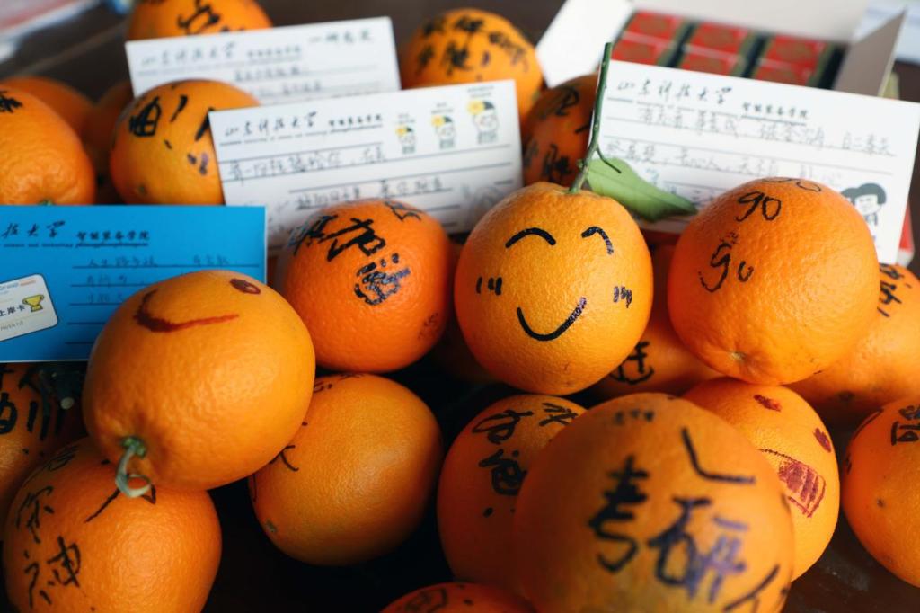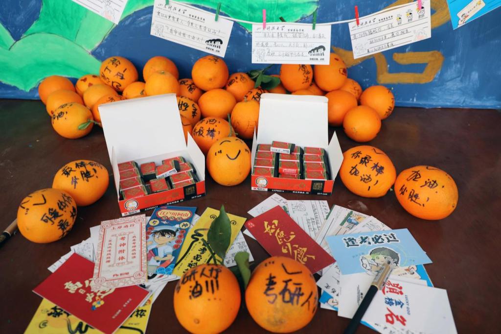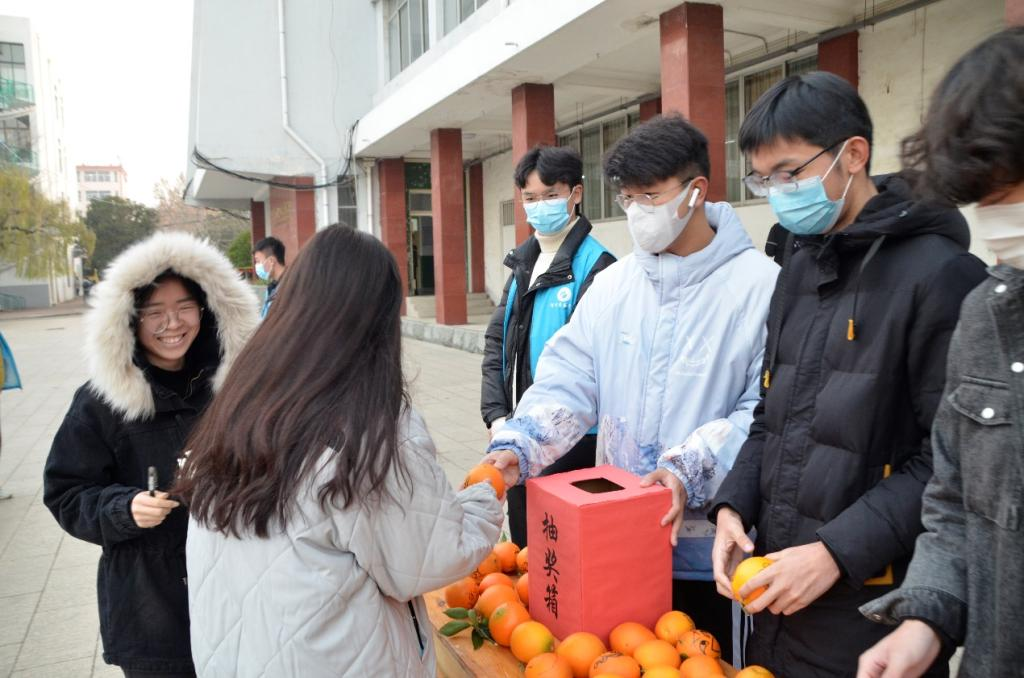 考研学子领取黄澄澄的橙子,寓意心想事“橙”