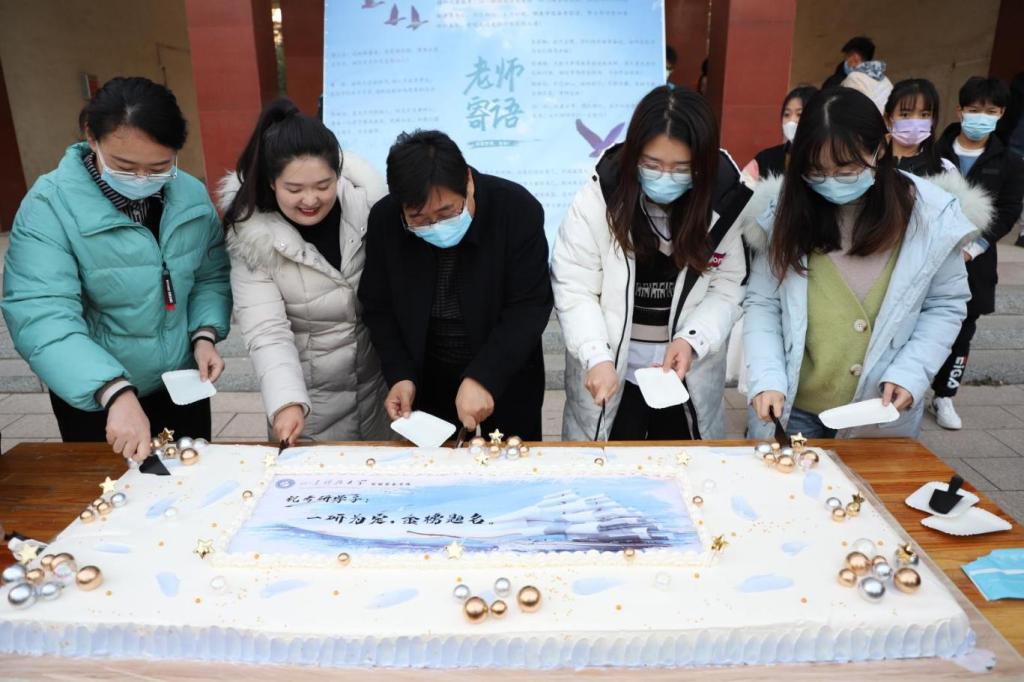 学院特地为考研学子定制了蛋糕作为一份特殊礼物。蛋糕印有“一研为定,金榜题名”的祝福,并配以星空、帆船,寓意着考研学子开拓进取,一帆风顺。学院党委副书记兼副院长裴国栋和辅导员老师们共同切下第一刀,并将包含祝福的蛋糕亲手传递给考研学子,祝愿他们金榜题名,步步“糕”升!