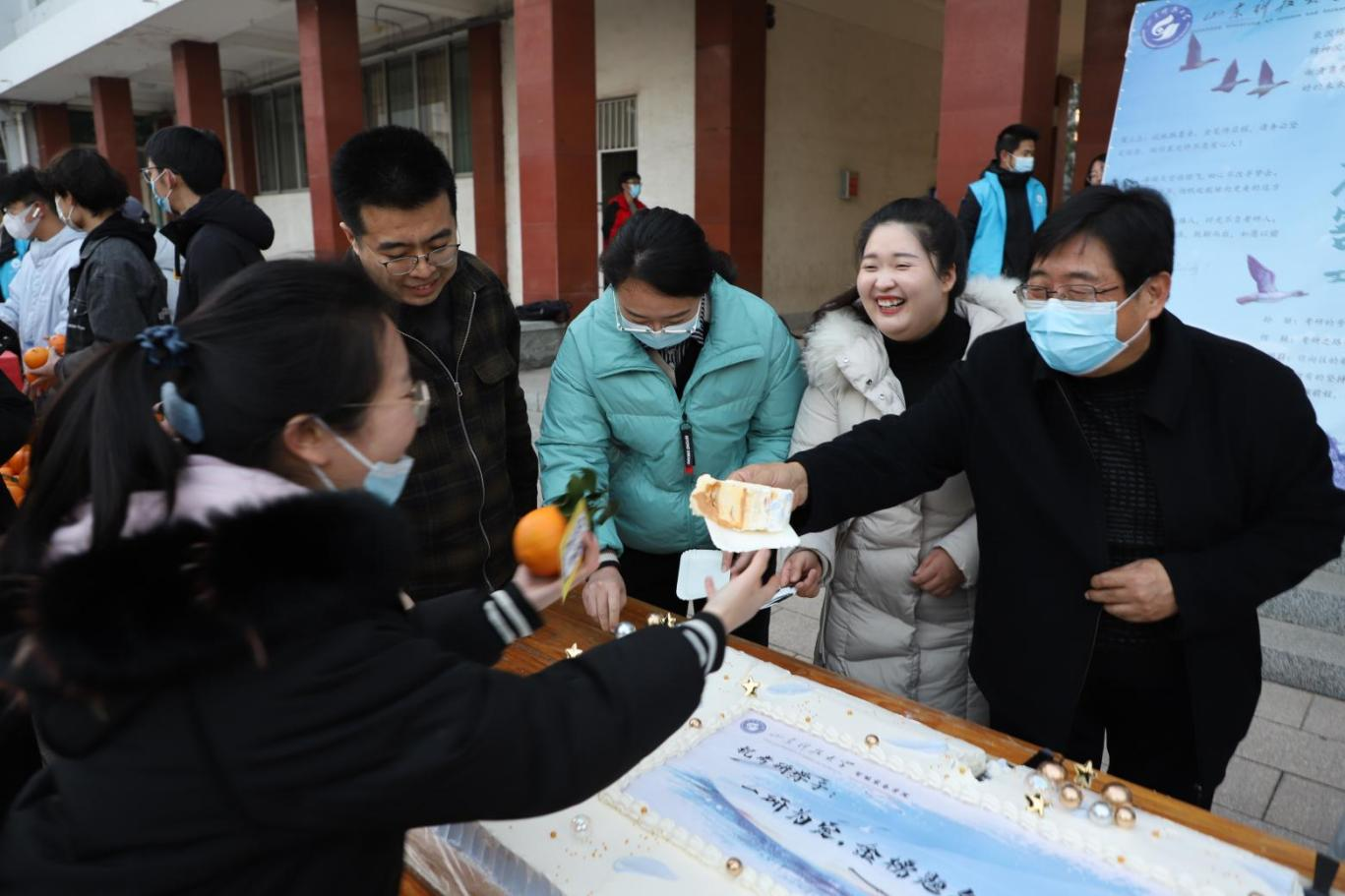 老师们将甜蜜的蛋糕分发给考研学子们