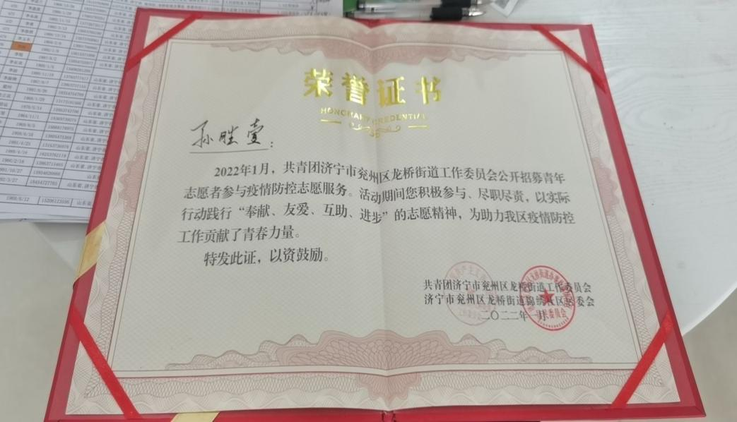 孙胜壹同学以踏实肯干的精神、严谨负责的工作态度赢得了社区居民与工作人员的一致好评,并获得了“优秀志愿者”的称号。其实,像他这样的同学还有很多,他们在学校里努力学习、积极组织参加各种活动,而当国家需要时便毫不犹豫地挺身而出,为祖国献出自己的一份力量。