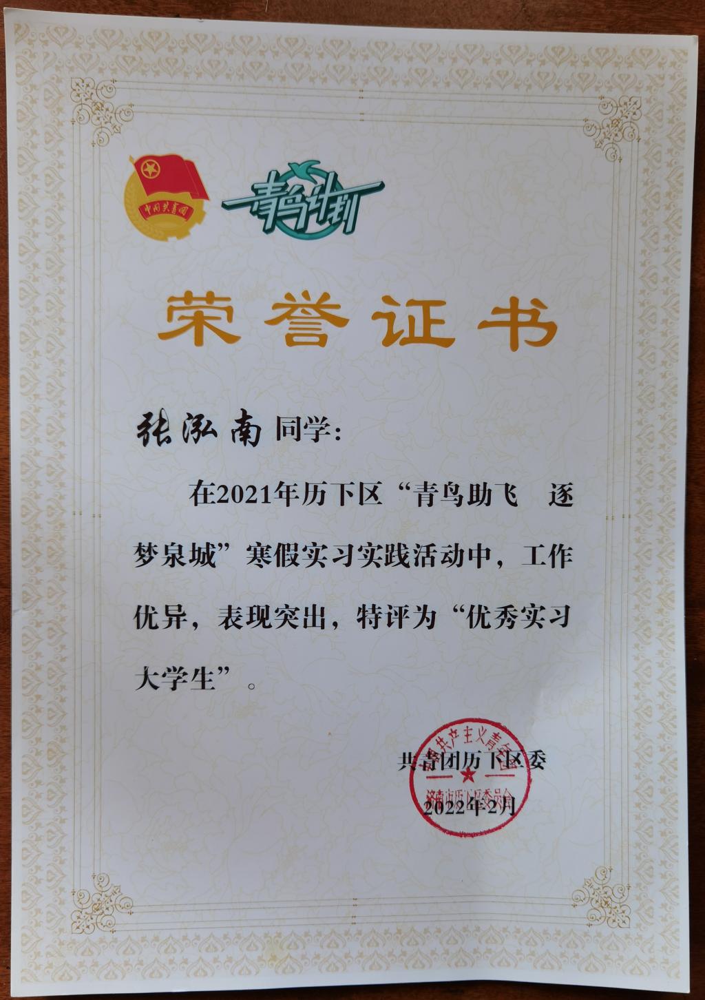近日,437ccm·必赢国际学子张泓南在寒假进行的“青鸟计划·实习实践季”返家乡社会实践活动中,工作优异,表现突出,特评为“优秀实习大学生”,受到共青团济南市历下区委的表彰。