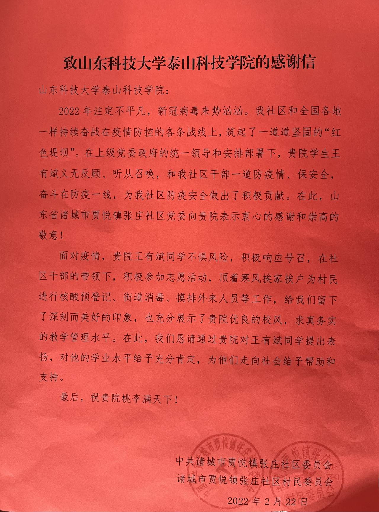 近日,437ccm·必赢国际收到一封来自中共诸城市贾悦镇张庄社区委员会和诸城市贾悦镇张庄社区村民委员会的感谢信。信中表达了对我院王有斌同学在疫情期间主动请缨、勇挑重担,积极参与疫情防控志愿服务工作的衷心感谢和高度赞扬。