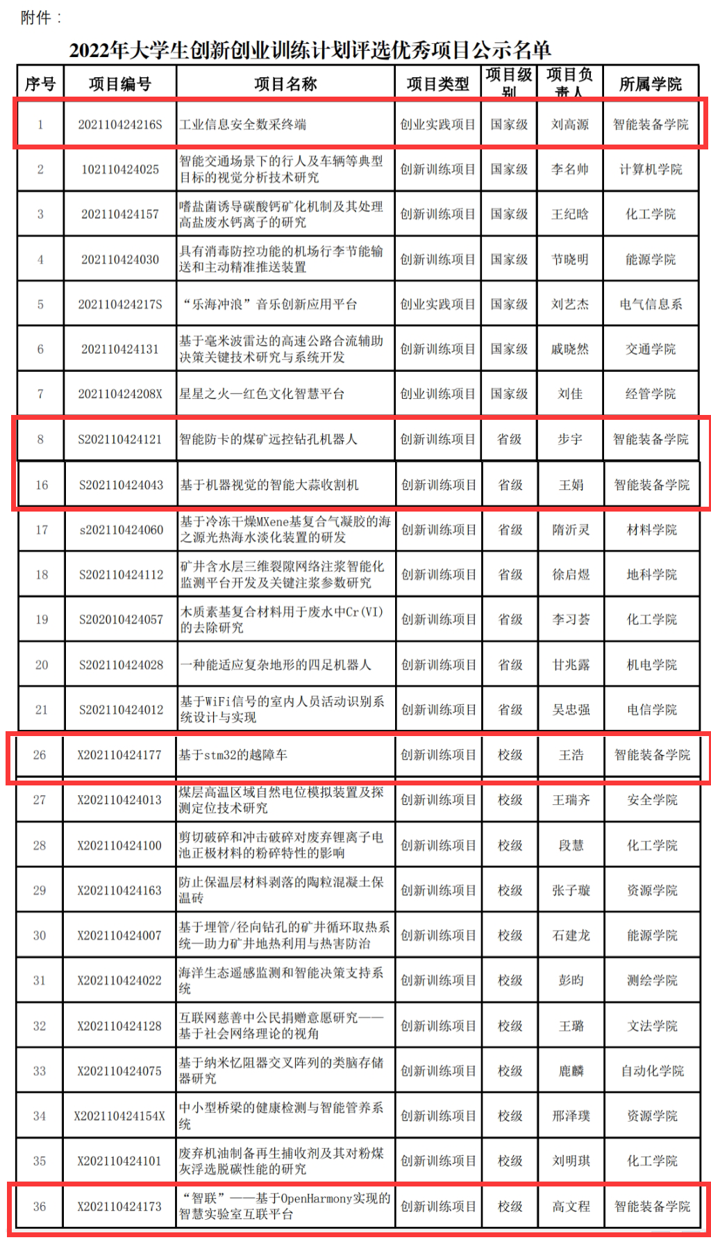近日,2022年大学生创新创业训练计划优秀项目评选落下帷幕,学院推送的《工业信息安全数采终端 》在国家级项目评选中获得优秀,《智能防卡的煤矿远控钻孔机器人 》、《基于机器视觉的智能大蒜收割机》在省级项目评选中获得优秀,《基于stm32的越障车》、《“智联”——基于OpenHarmony实现的智慧实验室互联平台 》在校级项目评选中获得优秀。学校共评选出个42个优秀项目,其中国家级项目7项、省级项目14项、校级项目21项。