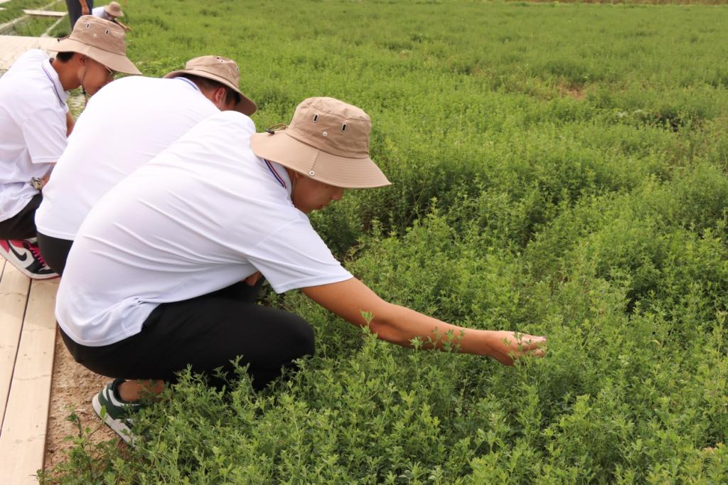 实践团队成员在耐盐碱地研究苜蓿生长情况