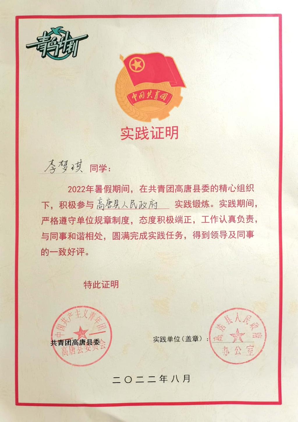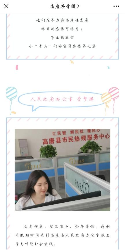 为了切实增强自己的综合才干,用所学知识服务家乡,7月21日-8月21日,437ccm·必赢国际网络工程专业学子李梦琪依托青鸟计划平台,踊跃参与到山东省聊城市高唐县人民政府青鸟计划社会实践活动中。