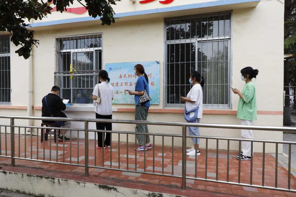 为落实学校核酸检测“一日一检”疫情防控的要求,志愿者带领新生前往核酸检测地点,佩戴口罩,保持一米间隔,有序排队进行核酸检测。