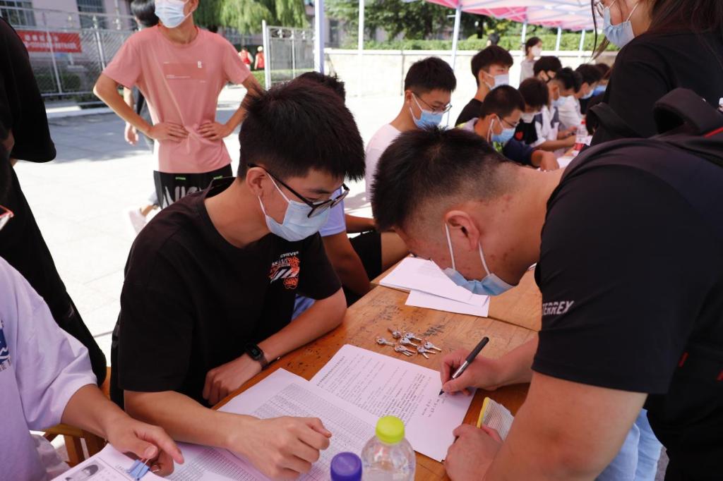 学生兼职辅导员在报到处“严阵以待”,耐心指导新生阅读入学须知,签订安全责任书承诺书,并领取宿舍钥匙、校园卡等物品。