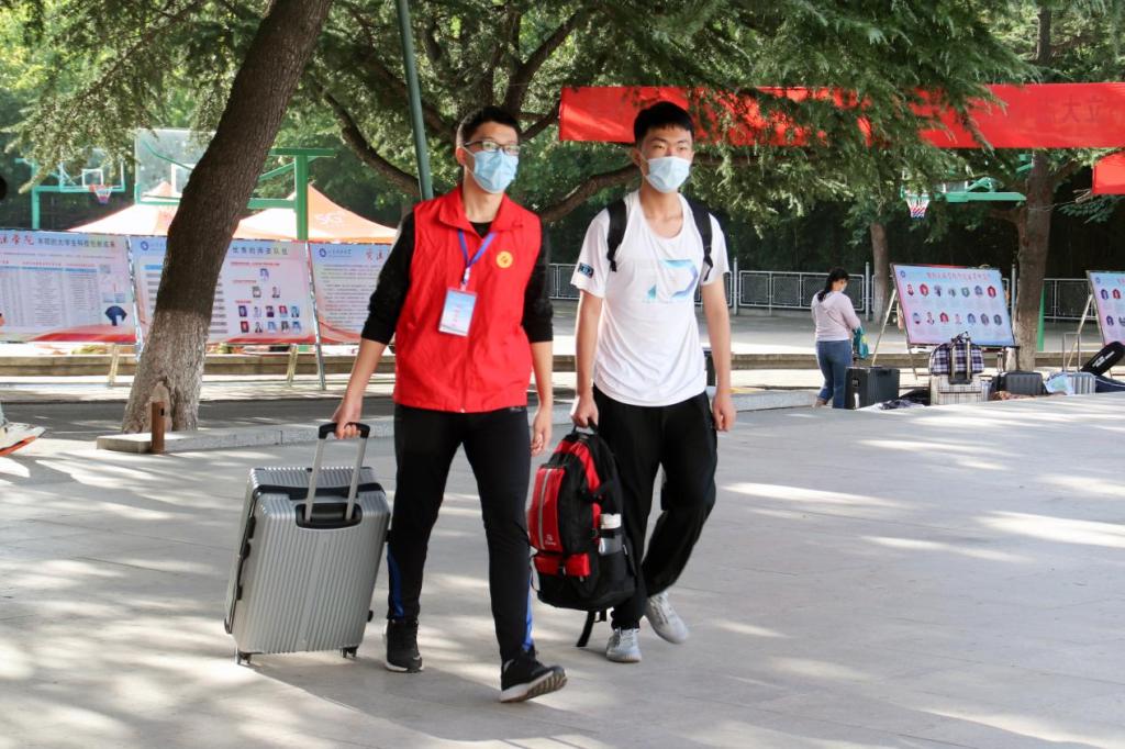 入校后,学生志愿者积极接过行李,引导新生至学院报到处,完成报到登记。
