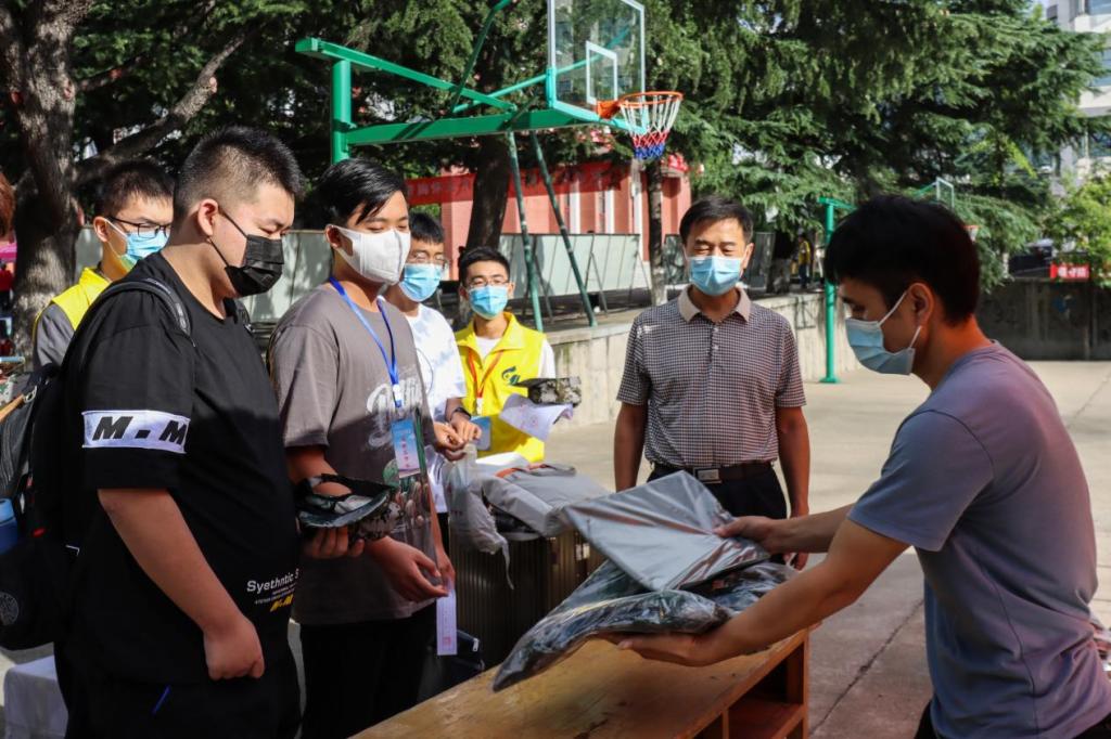 军训服发放点,工作人员细心询问新生的尺码信息,将崭新的军训服装交给新生。
