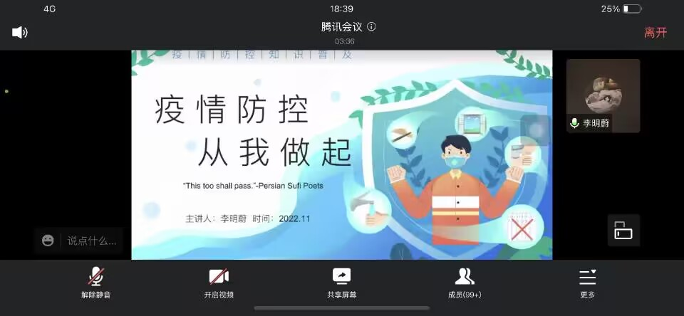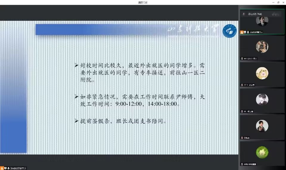 会上,辅导员向同学们介绍了学校周边的疫情形势并传达了泰安市泰山区、岱岳区及校区近期疫情防控工作的相关规定、要求,详细询问记录了同学们近期在学习、生活中遇到的困难、问题与诉求,并对同学们在疫情防控和校园封闭管理政策方面存在的疑惑和问题做了一一解答。