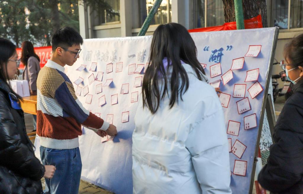 “2024考研必定上岸”“明年此日青云去,却笑人间举子忙”“愿你旗开得胜,一战成研”“道阻且长,行则将至”......考研学子们将壮志和对自己的话语凝于笔尖,篆刻在纸上,贴到“远赴人间惊鸿宴,一睹人间盛世‘研’”的主题展板上,考研的学子们看着他们自己对考研的期许、目标和决心,对于即将迎来考试也倍感信心,祝福考研学子们在剩余的时间里认真复习,必定上岸。