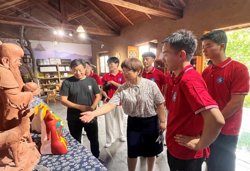团队第一站来到枣庄,团队来到山亭区徐庄镇石嘴子村村中博物馆,跟随解说员共同学习彩丝铝艺、枣庄泥塑、烙画、香文化、袁氏木雕、徐庄剪纸的独特魅力。团队成员有幸与非遗传承人刘进潮进行面对面交流,刘进潮老师讲解了他的作品《虎虎生威》,一件小小作品,融合了青铜人面兽像、京剧脸谱等众多中华文化元素,诠释着中华文化的创新与发展。“天地英雄气,千秋尚凛然。”团队一行心怀敬畏,来到台儿庄大战纪念馆。跟随讲解员的步伐,团队成员先后参观了台儿庄大战史料馆、六十军史料展厅和战地记者馆。团队队长林奥炜在参观后表示,“讲解员引领我们穿越时空的隧道,重温那段波澜壮阔、可歌可泣的抗战岁月。随着脚步的逐渐深入,我们仿佛能听到历史的回响,感受到那份沉甸甸的家国情怀,在心灵的深处激荡起层层涟漪。”