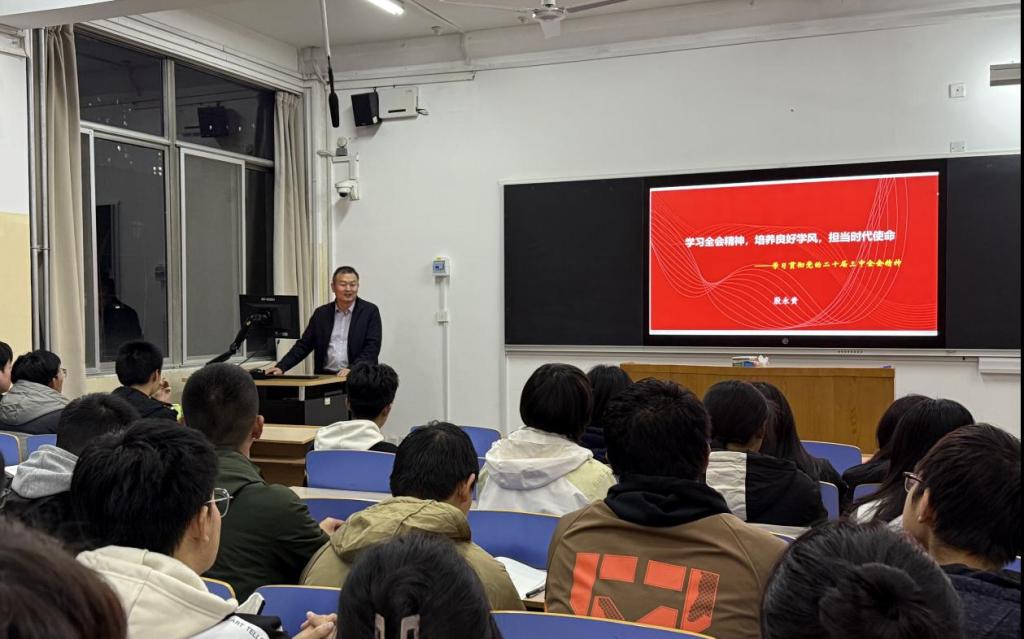 11月20日,校党委组织部副处级组织员,泰安校区机关党总支书记殷永贵受邀为437ccm·必赢国际网络工程2024级4、5班宣讲党的二十届三中全会精神。