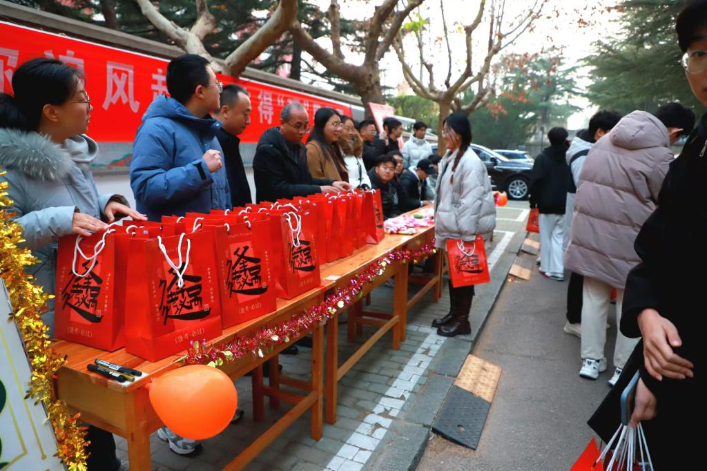 考研学子们怀揣希望与憧憬,目光熠熠,于精心布置的场地有序排队,学生会成员们此前早已用心筹备,将奶糖、暖手宝、咖啡等贴心礼品,连同蕴含着对学子考场超常发挥期许的精品文具、寓意好运与能量的雪饼、旺仔牛奶、饱含平安顺遂祝愿的橙子以及象征苦尽甘来的棒棒糖一一悉心置入福袋。