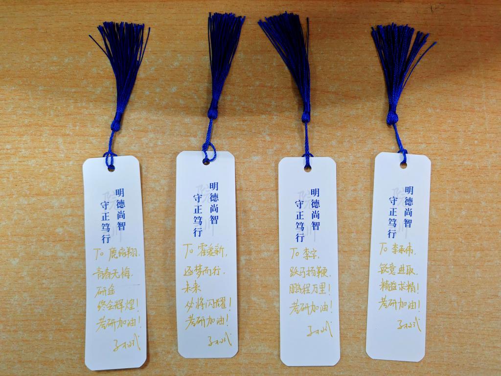 不仅如此,辅导员老师们也纷纷行动起来,他们亲手书写书签祝福。每一个书签都承载着老师们的心意,书写着如“研途相伴,梦想必达”“坚持终有回报,胜利就在前方”等温暖话语。这些书签将被放置在为考研学生准备的礼包中,成为他们在书海奋战间隙的一抹温馨慰藉,小小的书签,寄托着大大的期望,也凝聚着学院对考研学子无微不至的关怀。