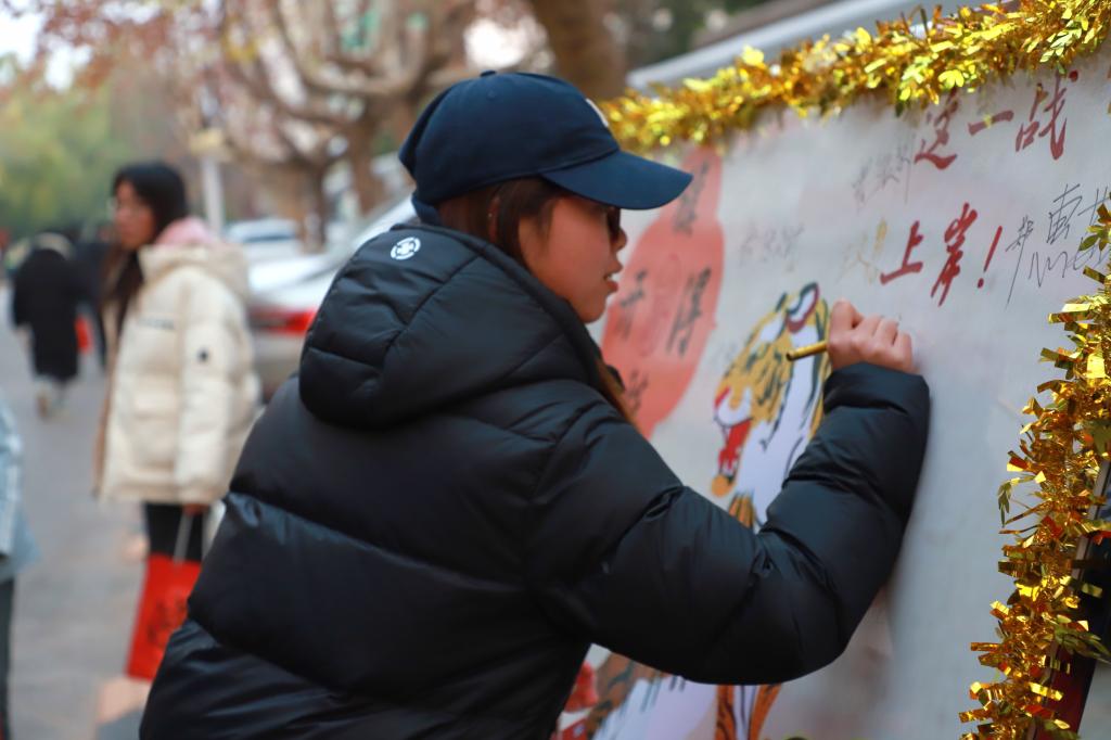 “考研之战,必胜无疑”“他年折桂步蟾宫,必定辉煌耀门楣”“愿君扬帆起航,功成圆满”“路虽远,行则必达”……考研学子们将满心壮志与对自我的砥砺之言倾注于笔端,镌刻于精美的签名板上。那一个个刚劲有力的字迹,犹如闪耀星辰,照亮了他们前行的方向。充斥着学子们对考研的憧憬、目标与决心,学子们面对即将来临的大考,愈发信心爆棚。愿考研学子们于余下时光精研覃思,铸就华章。