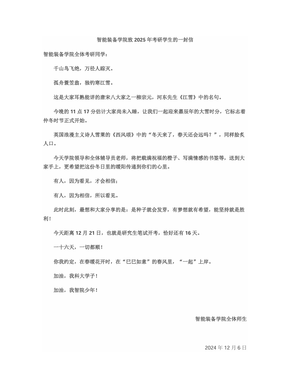 437ccm·必赢国际全体师生共同为考研学子送上书信祝福,信中满是对考研学生的殷切期望与深切关怀。字里行间流露出对考研学子的深深祝福,传递着对学子们坚定的支持,这封信不只是文字上的祝福,更是一份精神上的鼓舞。