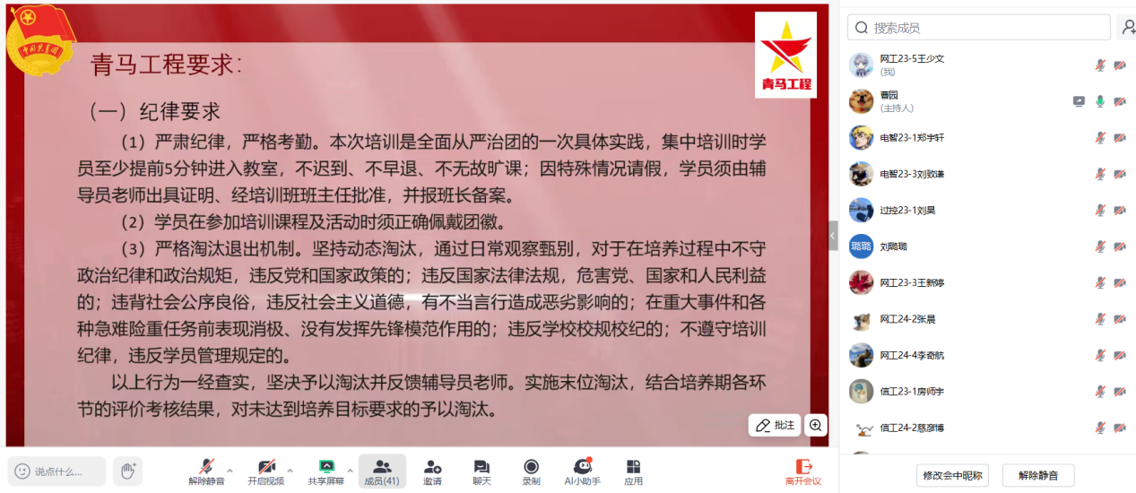 会上,曹园以“智燃青春梦,能铸担当魂”为主题,围绕共青团发展历程、团员权利义务、“青马工程”等重点工作进行了讲解,明确了“智燃青春梦,能铸担当魂”青马工程基础培训班的培训要求与培训内容,为学员们带来了内涵丰富的开班第一课。她强调,学员们要深入学习习近平新时代中国特色社会主义思想和党的二十大及党的二十届三中全会精神,高举中国特色社会主义伟大旗帜,在实践中锻炼能力、发扬艰苦奋斗精神。学员们在会后表示会珍惜学习机会,将理论用于实践,争当新时代马克思主义的坚定信仰者、学习者、传播者和实践者。