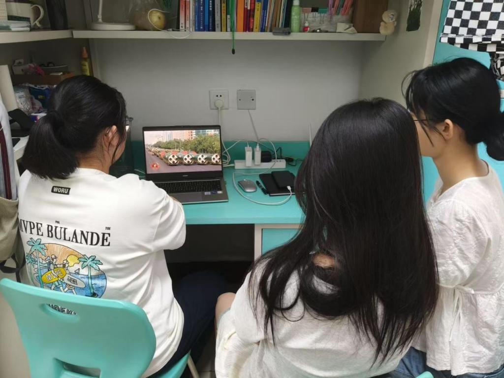 在教室、报告厅、实验室等集中观看现场,师生整齐端坐,全神贯注聚焦屏幕。阅兵式上,受阅部队英姿飒爽,步伐铿锵有力,新型武器装备依次亮相,一件件大国重器在阳光下熠熠生辉,空中梯队呼啸而过,充分展现了我国强大的国防力量和现代化军队建设的辉煌成就。屏幕前的师生们全神贯注,不时爆发出热烈掌声,为人民军队的威武雄壮而自豪,为祖国的繁荣强盛而欢呼。同学们纷纷表示要将自己对祖国的热爱融入到学习和工作中,将个人理想和奋斗目标融入到实现中华民族伟大复兴的中国梦。