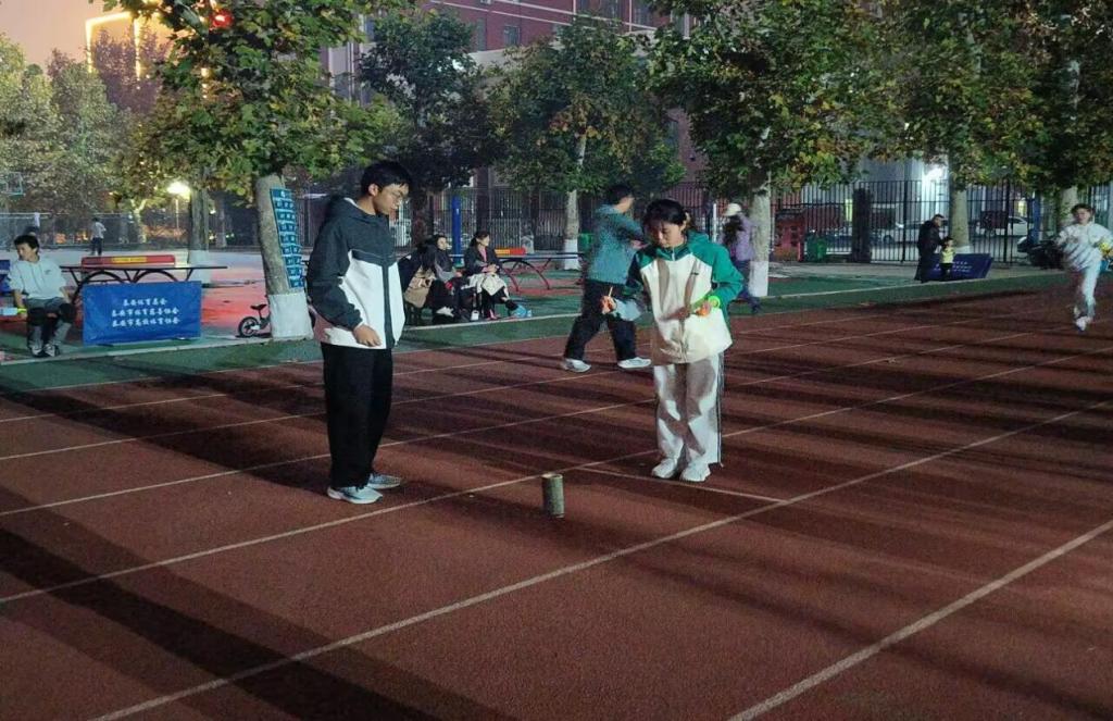 本次比赛以小组赛形式开展,每组由四男两女组成,各小组凭借专属颜色的荧光棒区分组别,需接力完成三公里障碍赛,赛事设置“投壶”“摸石头过河” 两大特色关卡。赛道上,前一棒选手弓腰冲刺、稳递荧光棒,接棒者扎步待发、触棒即提速,荧光棒在夜色中划出利落弧线。“投壶” 环节,选手们凝神瞄准、果断投掷,中壶时队友击掌欢呼,未中时相互鼓劲。“摸石头过河” 关卡,大家小心翼翼踩道具稳身形,咬牙向终点奋进。场边观众挥臂呐喊,现场活力满溢。
