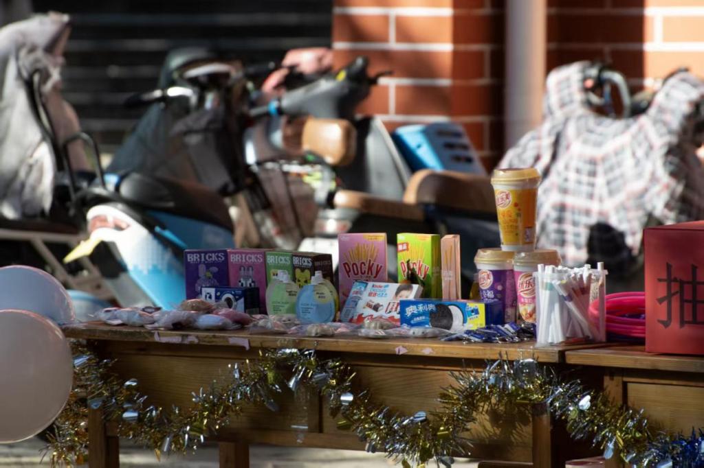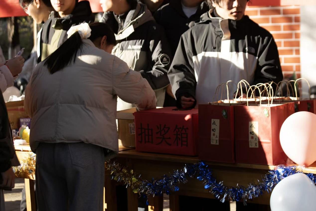 活动现场设有抽奖趣味区域,为学子搭建释放压力的欢乐平台。刚领完福袋的同学,很快被这边的热闹吸引,纷纷围拢过来,好奇地打量着陈列的奖品与抽奖箱。志愿者提前精心布置,桌面整齐摆放帆布包、毛绒玩具、解压捏捏乐、巧克力、零食礼盒等贴合同学们需求的奖品,分设一、二、三等奖项。